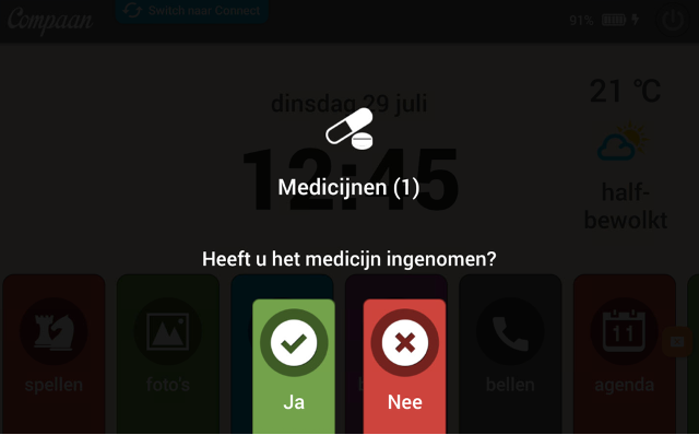 - De medicijnherinnering niet binnen 60 minuten na tonen is beantwoord (dit kan gebeuren als de gebruiker de vraag nog niet heeft opgemerkt