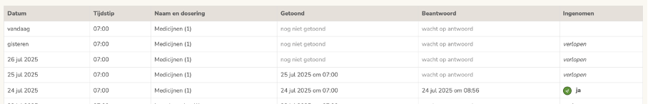 Bij historie kunt u de laatste 30 medicijnherinneringen inzien. U kunt zien of de medicijnherinnering is getoond, hoe laat deze is beantwoord en of de medicijnen zijn ingenomen (antwoord ja of nee).