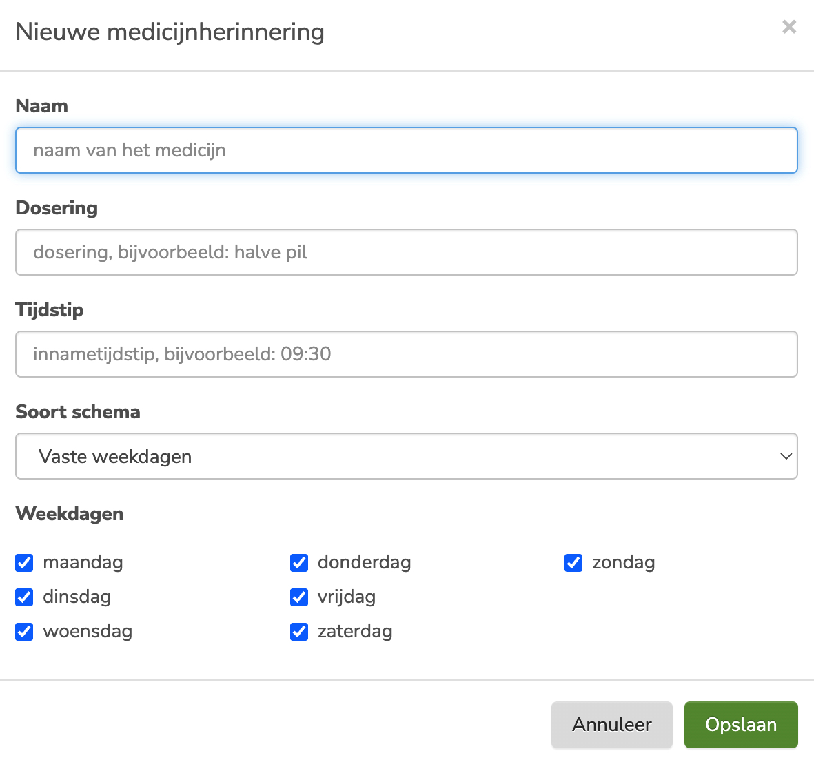 Bij soort schema kunt u kiezen voor 'vaste weekdagen' of 'iedere ... dagen'. Bij weekdagen kunt u de dagen selecteren waarop het medicijn genomen moet worden: