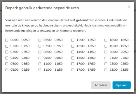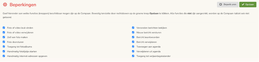Het is mogelijk om beperkte uren in te schakelen. Gedurende deze uren zijn de knoppen op het beginscherm uitgeschakeld. Het is dan nog wel mogelijk meldingen te ontvangen en hierop te regeren.