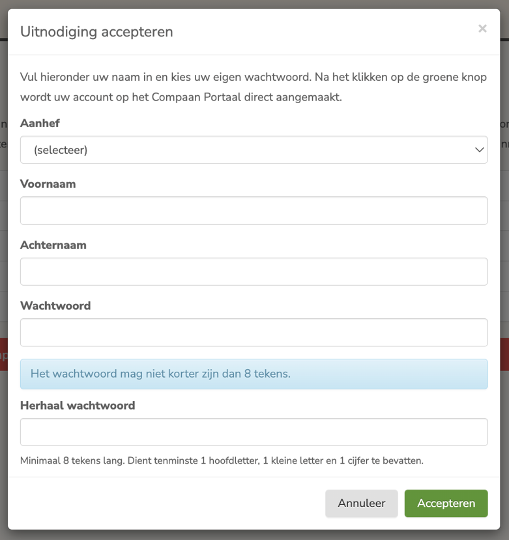 Klik op 'accepteren' om uw account aan te maken. Daarna kunt u meteen inloggen in het Compaan Portaal.