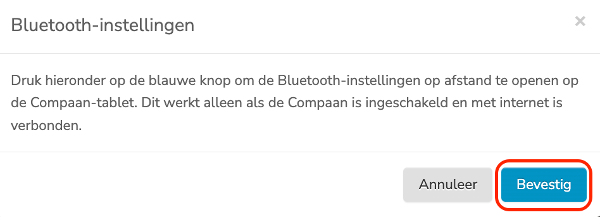 Op de Compaan verschijnt nu de melding: op afstand Bluetooth-instellingen geopend. Zet de schakelaar van 'uit' naar 'aan' om de bluetooth in te schakelen en de beschikbare apparaten te zien.